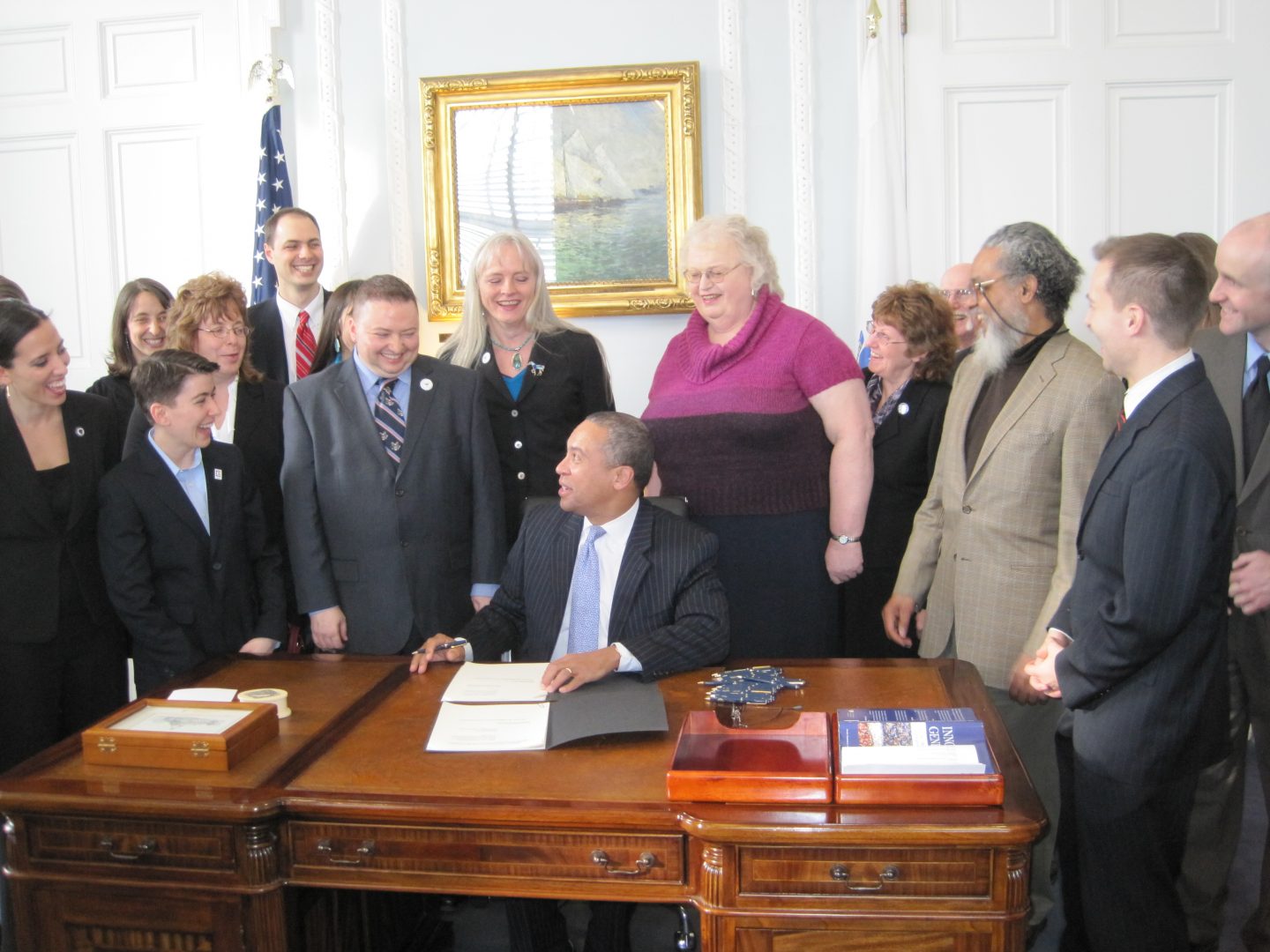 By 2007, MTPC began advocating for statewide legal protections for transgender people. Over the course of five years, we fought for various iterations of The Transgender Equal Rights Bill, an anti-discrimination bill sponsored by representatives Carl Sciortino and Byron Rushing. Despite two failed attempts, the act finally passes in 2011. The act gives transgender people equal protections when seeking employment, housing, credit, and education and expands the state’s hate crimes protections to now include transgender people.